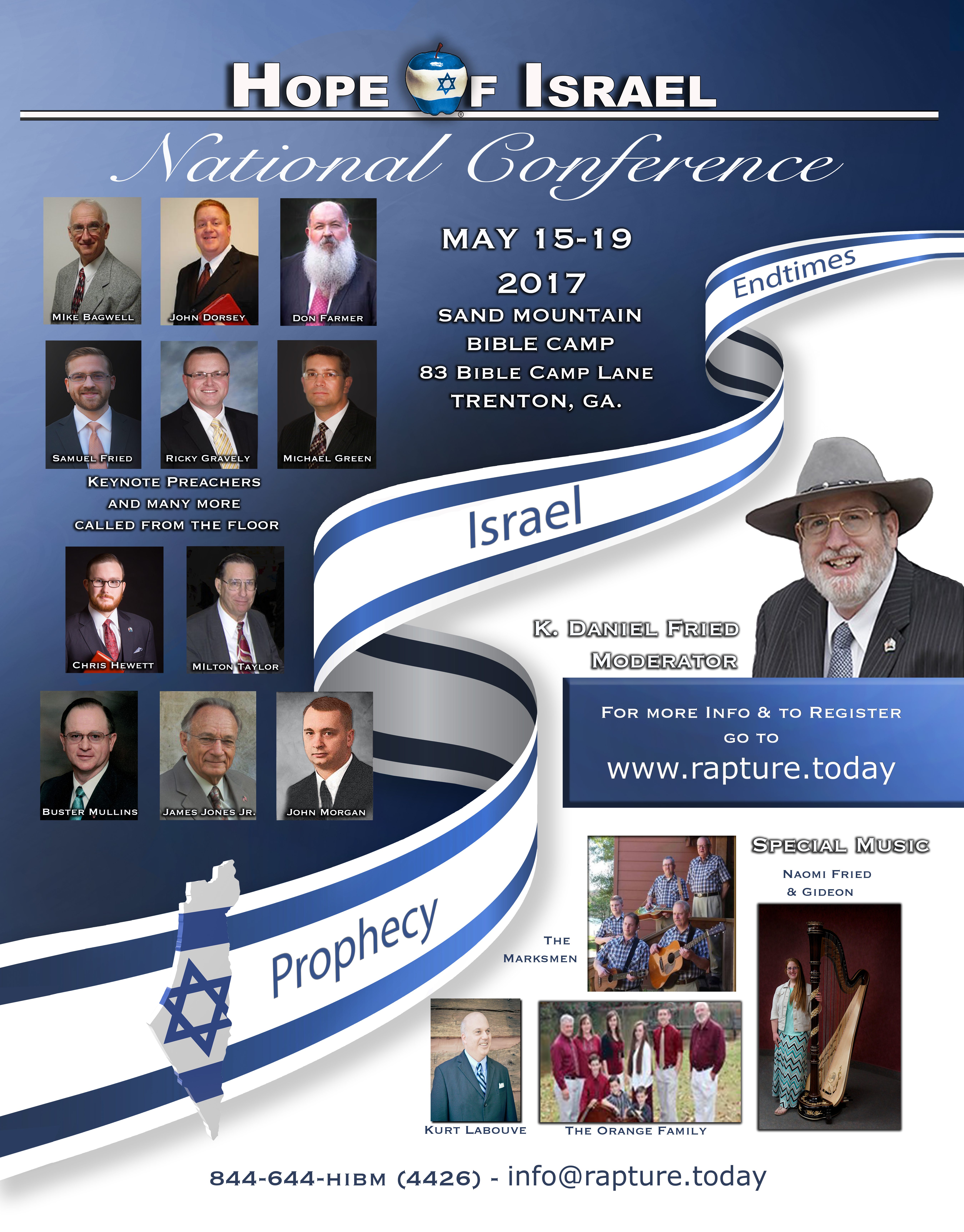 Attend one of the best Bible Prophecy Conferences you will ever go to – www.Rapture.Today – Hope of Israel National Conference on Israel, Prophecy, and the EndTimes – May 15-19, 2017. This will be an Old-fashioned, Revival Spirit, Bible Believing, Fiery Preaching meeting that you will never forget!